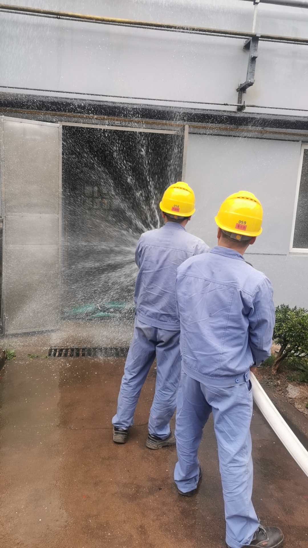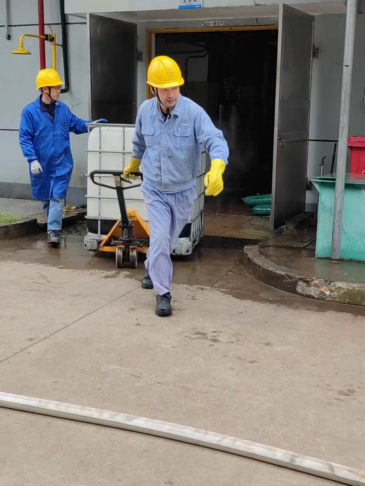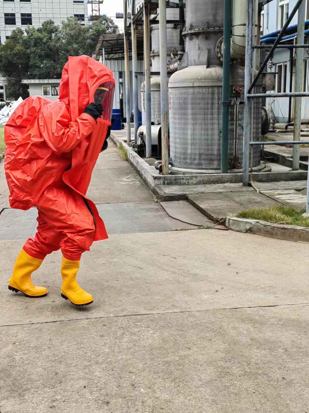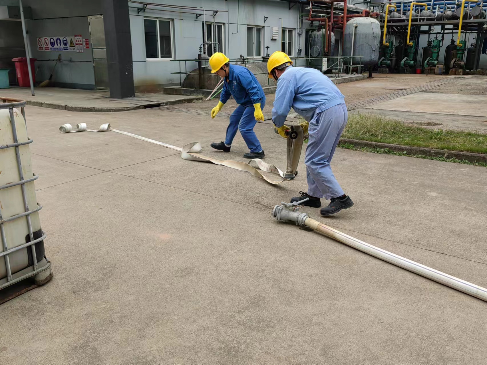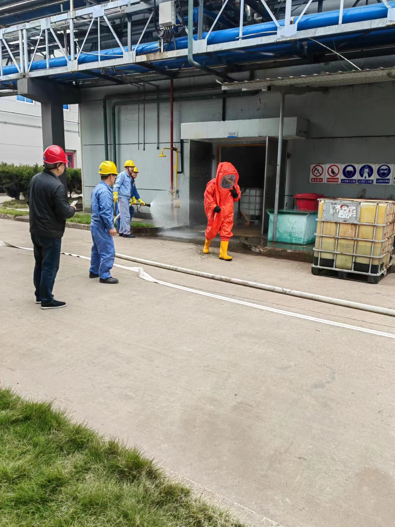 本次演練模擬五車間裝殘液的噸桶發(fā)生異?;瘜W(xué)反應(yīng),進(jìn)料口處不斷噴料,現(xiàn)場出現(xiàn)大量泄漏,空氣中彌漫大量有機蒸氣,為防止事態(tài)擴大以致空間爆炸而采取應(yīng)急處置的過程。